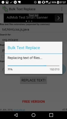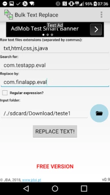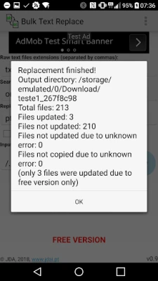 The output will be created in the device "download" directory, with the same input tree directory structure. The files inside will be an unmodified copy of the originals if no text replace was done, or an updated version if a replacement took place. Files with a different extension than the ones to analyse will be copied to the destination as well.