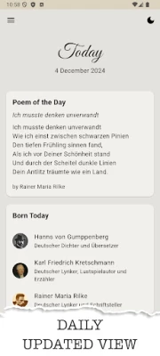 The "German Poetry" app has been around since 2015 and remains the top choice for lovers of German poetry. It has now been completely rebuilt from the ground up, with a focus on performance, design, and user experience—specially optimized for modern devices.